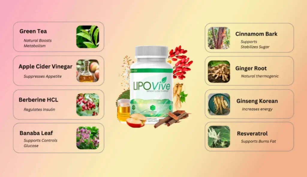 Lipovive is made from four carefully selected natural ingredients: green tea extract, ginger root, apple cider vinegar, and cinnamon. Together, in precise proportions, they help calm cravings, support blood sugar balance, boost energy, and target stubborn fat areas.
